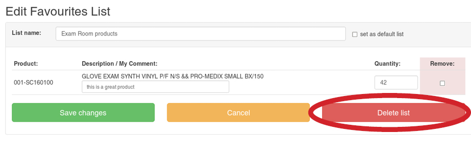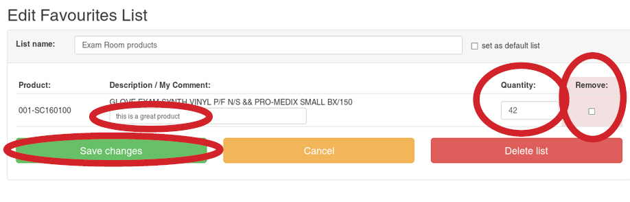 Modifiez les quantités par défaut et les commentaires sur les produits en modifiant les boîtes de texte correspondantes. Pour retirer complètement un produit d’une liste, utilisez les cases Retirer. Lorsque terminé, cliquez sur le bouton Sauvegarder les modifications.
