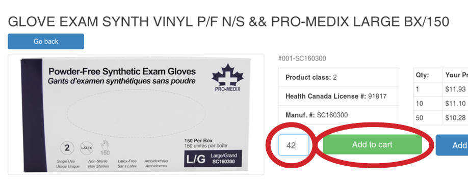 You're likely familiar with this method, as it's common on many other websites: find a product you want either by searching for a keyword or browsing categories list. Then enter the desired quantity and click the Add to cart button: